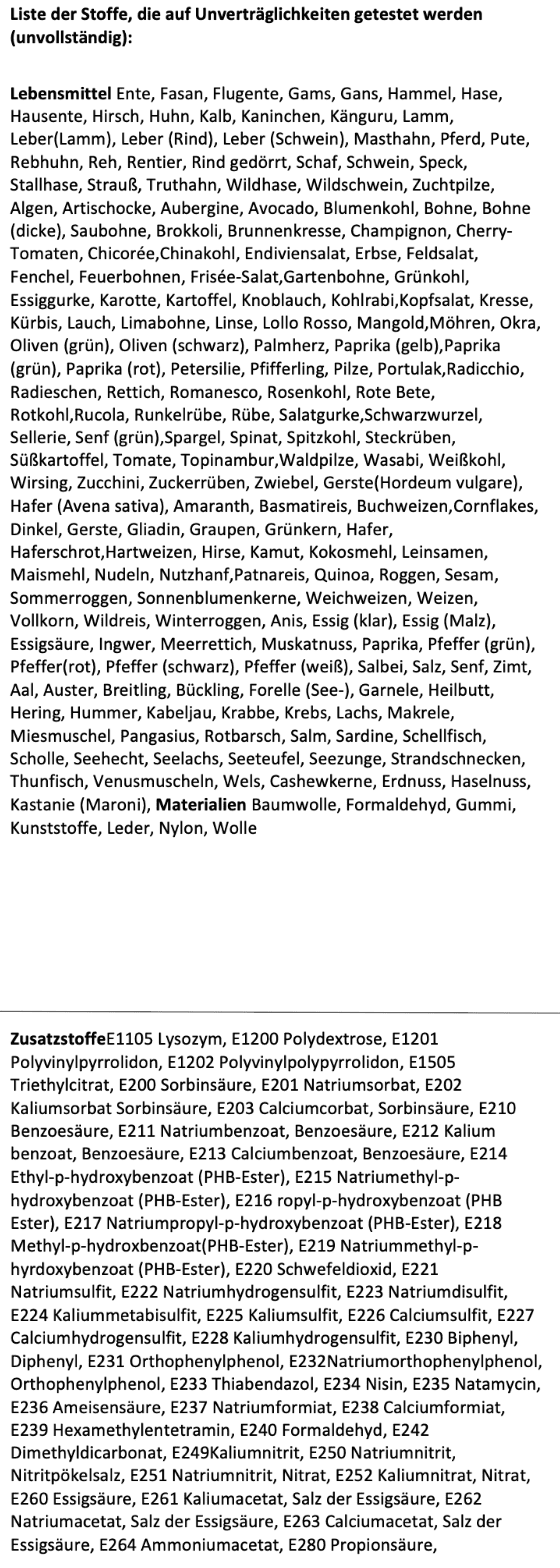 - Test auf über 600 Unverträglichkeiten (Lebensmittel, Getränke, Metalle, Tierhaare, Pflanzen, Fette, Zusatzstoffe, etc.)