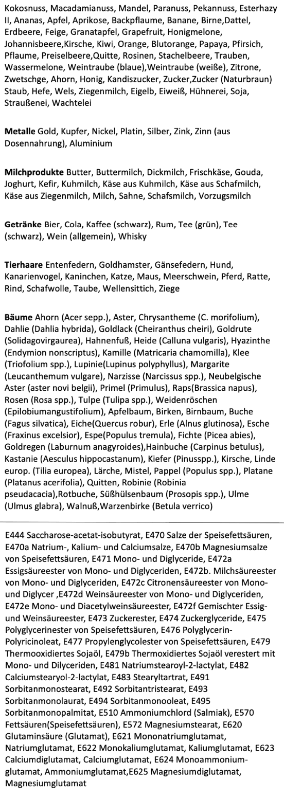Zusatzstoffe, Pflanzen, oder auch ggen Tier(haare) und Metalle auf.